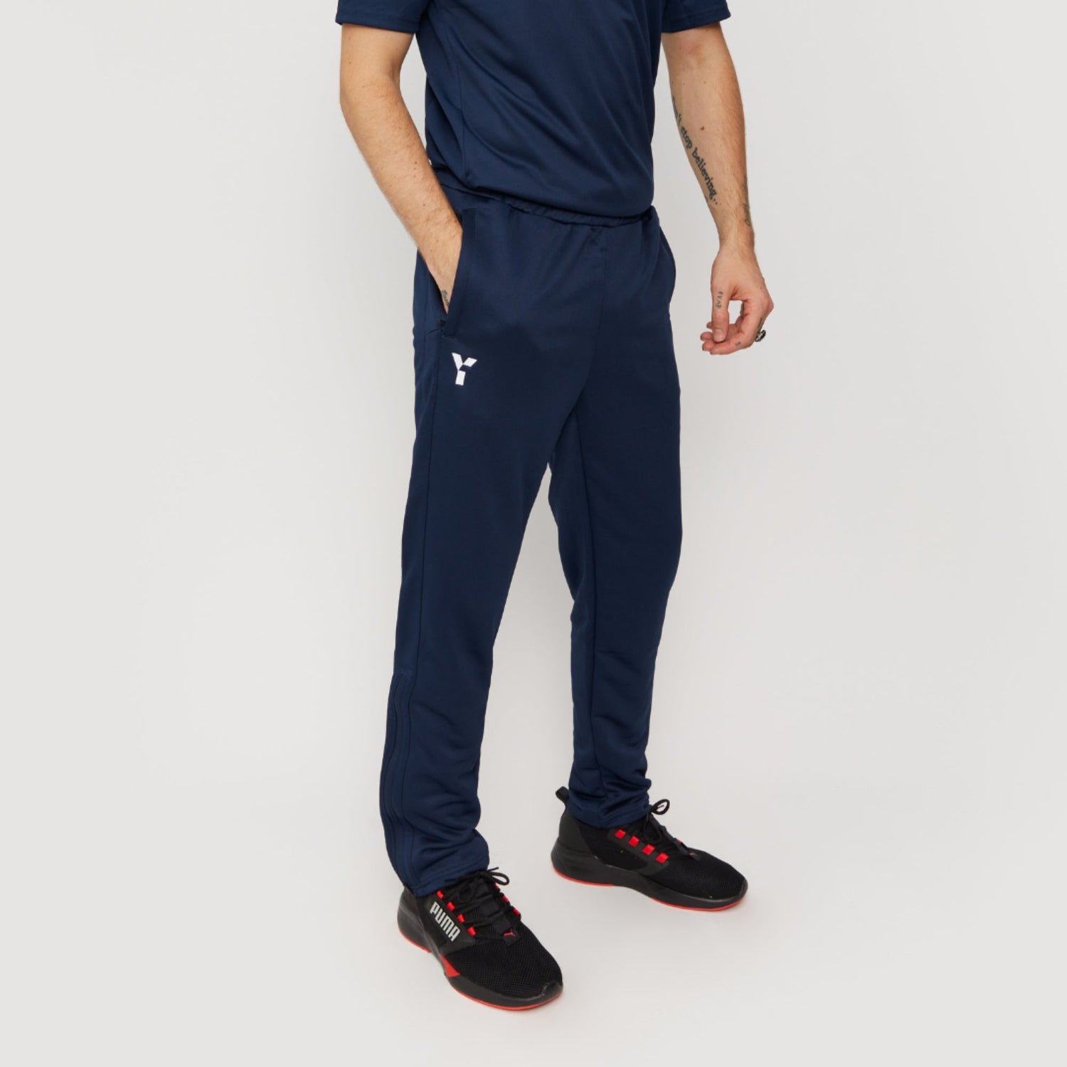 Official Y1 Tracksuit Bottoms. Crafted from 100% recycled PEC polyester material, our slim-fit bottoms include medium height ankle zips and zipped side pockets. These tracksuit bottoms are designed to maximise comfort & performance whilst honouring our commitment to sustainability.